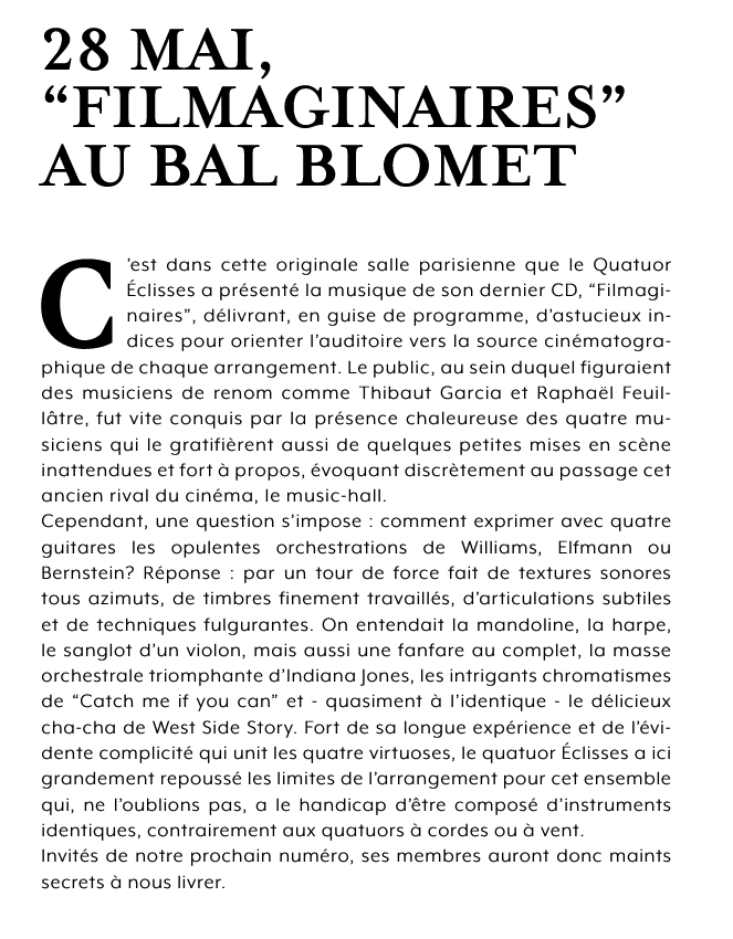 Nous avons inséré deux références de Roland Dyens, que nous avons bien connu : Filmaginaires, original pour quatuor de guitares, et Alfonsina y el mar, véritable hymne en argentine, arrangé avec un talent et une créativité dont il a le secret.